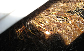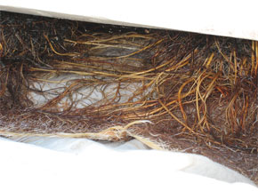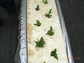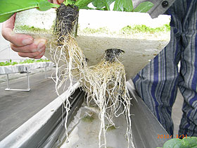 左側2列がピュアキレイザー使用ラインです。 同じ苗を定植して約3週間になりますが両者で著しい成長の違いが出てきています。 ピュアキレイザーを使用しない右側の通常ラインに比べ、ピュアキレイザー使用ラインは苗の生長が良い結果となっています。 下の写真では、根の成長(量)に圧倒的な違いがあることが良く分かります。